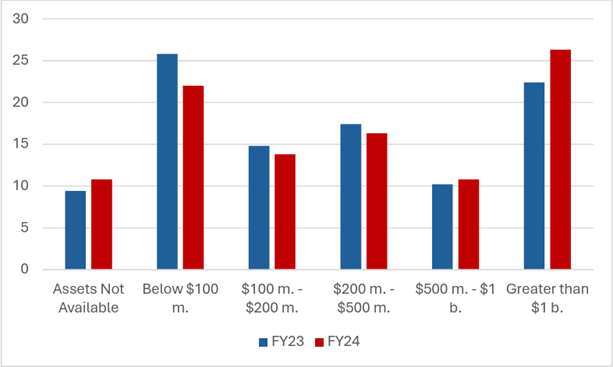 In fiscal year 2024, over 26.3% of reported transactions had an asset value for the to-be-acquired entity of greater than $1 billion. Only 22.4% of transactions reported in fiscal year 2023 were at this same level.