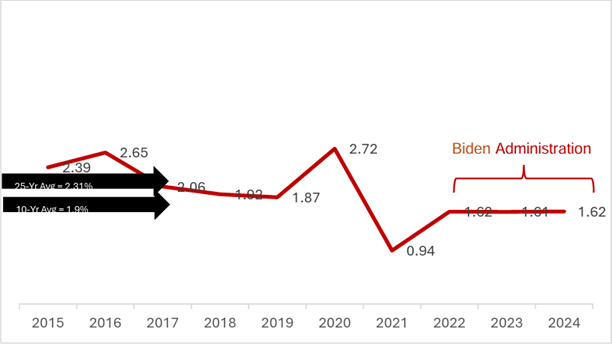 - The HSR Annual Reports are based on data covering the government's fiscal year (October 1 through September 30). This does not correspond to the dates of Presidential Administrations. To account for this timing discrepancy, years that span multiple Administrations are removed from the data. As a result, the Bush Administration data is based on the HSR Annual Reports for Fiscal Years 2002 through 2008; the Obama Administration data on Fiscal Years 2010 through 2016; the Trump Administration data on Fiscal Years 2018 through 2020, and the Biden Administration data on Fiscal Years 2022 through 2024.